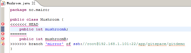 假设现在Mairo兄弟在用GIT协作开发NewSuperMairoBro游戏,目前服务器端的mushroom.java文件的内容如下: