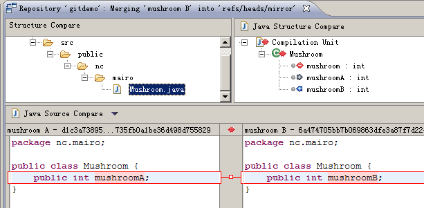l 最后将原分支的更新部分mushroomA提交到当前分支的后面,就是要在mushroomB的后面添加mushroomA的更新,当然此时更新记录已经不是之前的mushroomA了,如果出现冲突则使用对比工具解决冲突,最后记录变成mushroomA*。