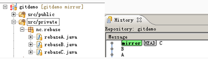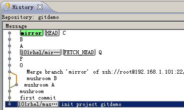 接下来看看rebase,其实rebase也是把两个分支进行合并的操作,当Mairo弟弟push更新后,服务器端的mirror分支的历史如下: