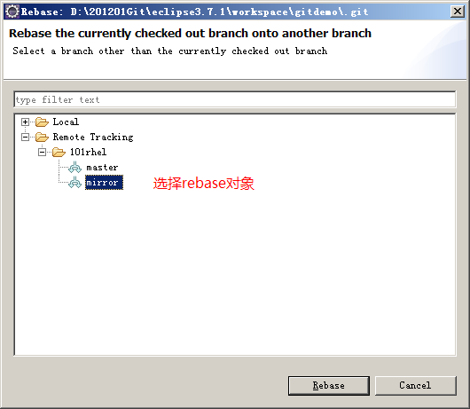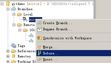 EGIT中默认的 pull操作是Fetch+Merge,如果要用rebase,可以分开操作。先执行Fetch更新remote