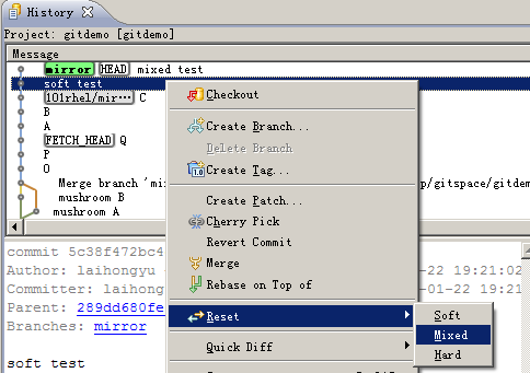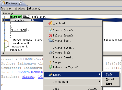 先进行一次提交,提交后在History窗口中重置此次提交,如图: