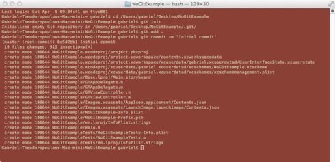 现在,为这个例子再创建一个工程,完事后可以删了它。在创建时取消那个创建git源的选项。这次我们不想让Xcode为我们准备一个源。把这个工程命名为NoGitExample,保存到桌面,然后你可以跟我接下来输入的命令一样。