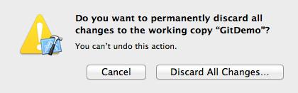 然而,这次我们不会使用这个按钮,我们要用Discard All Changes。点击它之后,一个确定提示框就会出现,这是这部分Xcode防止你误删代码的唯一措施。