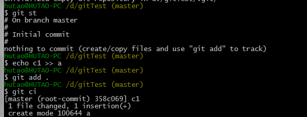 在master分支上,做一次提交c1,然后现在新建一个分支a,并切换到a分支。