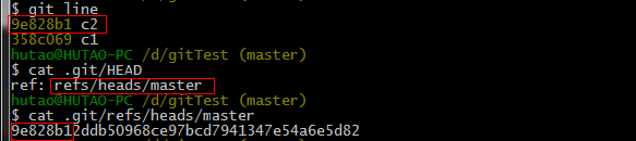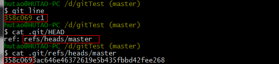 我们看到c1的提交hash值和HEAD对应分支master的当前hash值是一样的。也就是说,HEAD指向的是当前分支名master,而master又对应了当前的最新的一次提交ID.