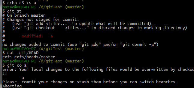我们身处master分支上,并且没有任何改动,这时候git checkout没有任何输出。然后,我们给a文件添加内容“c3”,然后再git