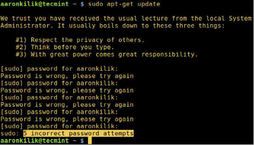 当用户输入错误密码时,sudo将通过insults参数显示侮辱性内容。它会自动关闭badpass_message参数。