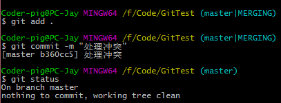7.小B把冲突解决后,git push origin master 把代码推送到远程仓库
