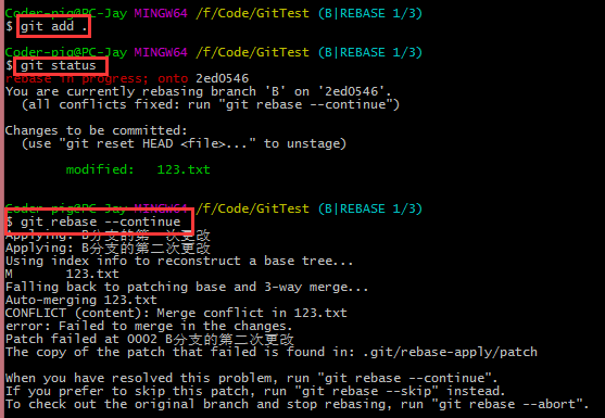 6.小B需要先解决冲突,git pull –rebase origin master,然后rebase慢慢玩