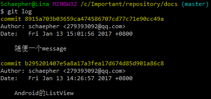 保存并退出,会进入下一个界面。修改第一行的commit message,即reword的那个message,为添加Android学习笔记,特别是ListView的介绍;添加对git