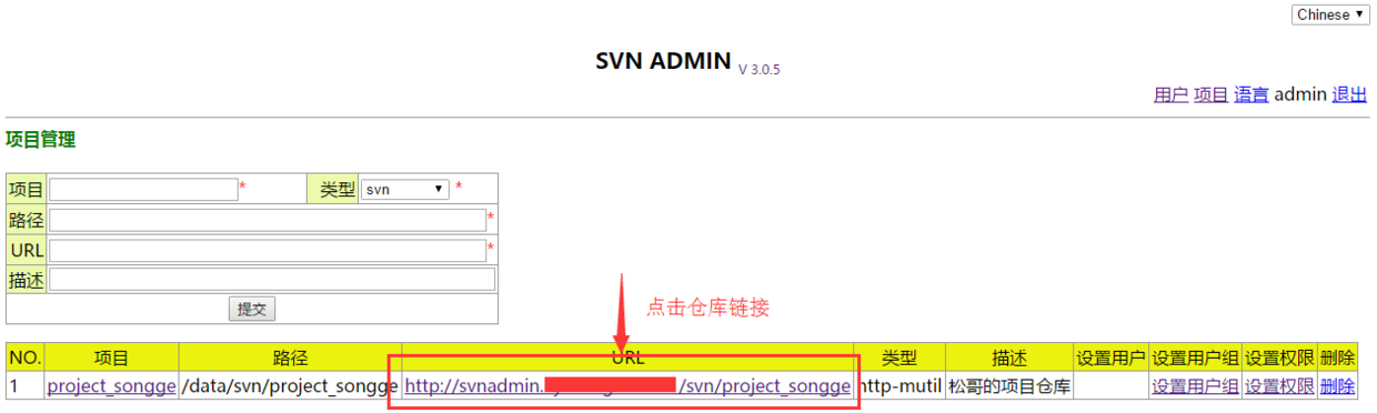 在SVN ADMIN的WEB页面中,可以看到项目管理的相关配置,改变了以往Linux Server上通过命令行管理svn的繁琐历史,而使用WEB