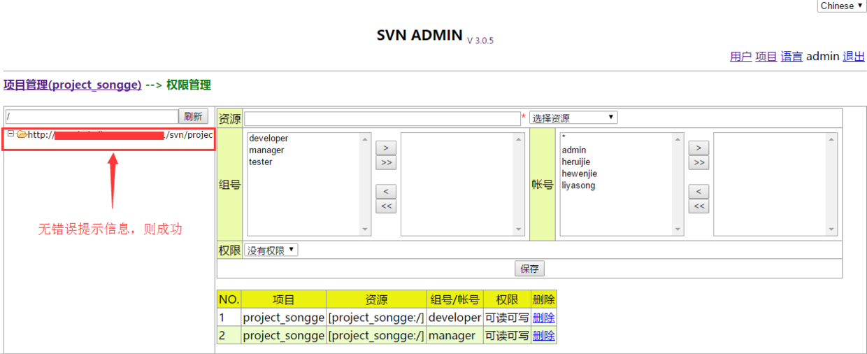三个文件中,配置用户和权限都是通过修改 passwd 和 authz,立刻就生效。 Svn Admin