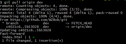 ① git pull origin dev 直接pull,代替fetch+merge操作,默认采用Fast-Forward模式合并。(此处应该采用(3)先fetch,再merge,分支结构更明显)
