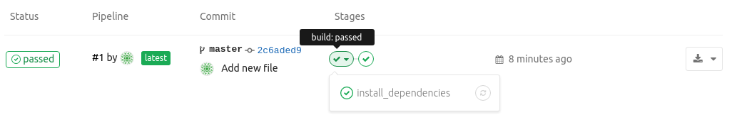 无论状态如何,单击正在运行或已通过的图标(如果遇到问题,则会失败)以查看CI运行的当前状态。单击顶部“Pipeline”菜单可以获得类似的视图。