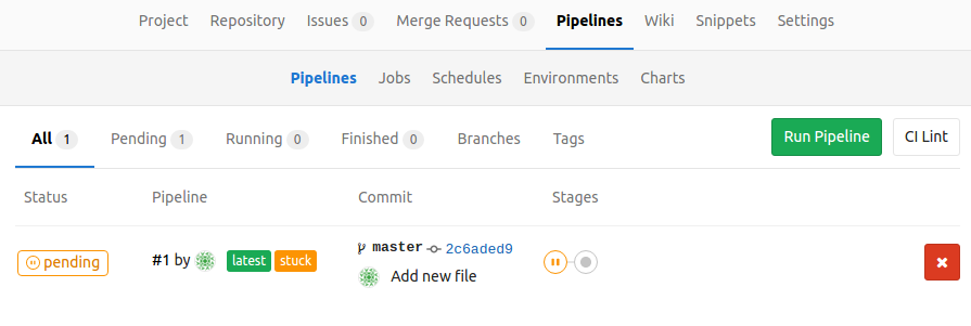 由于我们的存储库包含一个.gitlab-ci.yml文件,因此任何新的提交都将触发新的CI运行。如果没有可用的runner,则CI运行将设置为“pending”。在我们定义运行器之前,让我们触发CI运行以查看任务在待处理状态下的状态。一旦runner可用,它将立即开始运行。
