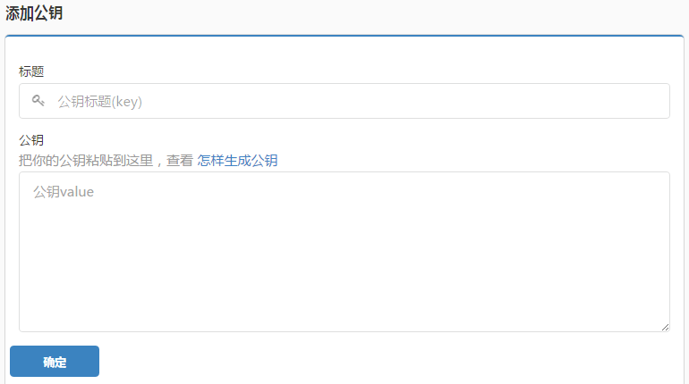 KEY,我们需要在这里创建我们的SSH KEY,标题任意,公钥中填入id_rsa.pub文件中的内容,点击确定即可。