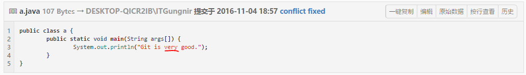 回到远程仓库中查看,可以看到 a.java 文件的提交事件变为了 conflict fixed ,而且文件内容也被改变了: