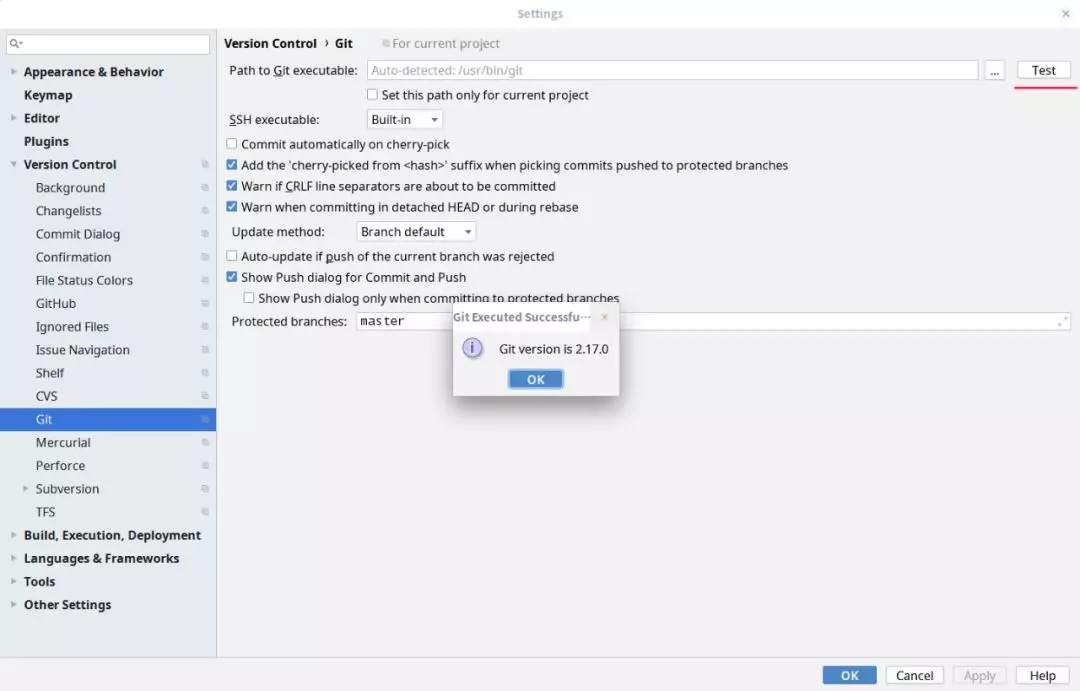 在第一项设置 Path to Git executable 配置Git的执行文件路径,点击右侧的