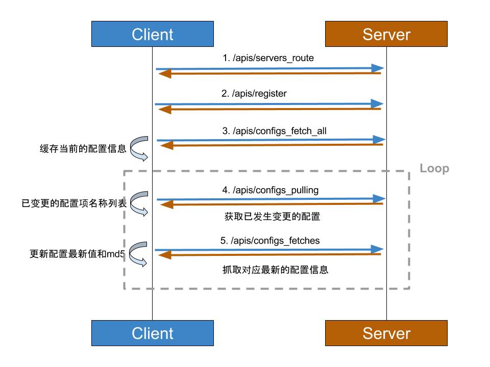 diablo默认实现了Java语言的客户端,希望以后能支持node,go,python等语言。由于diablo仅通过Http接口提供服务,不同语言只要遵循API接口,即可实现不同的语言版本。若读者有意实现,可参考该客户端规范,下图为客户端与服务端的交互过程: