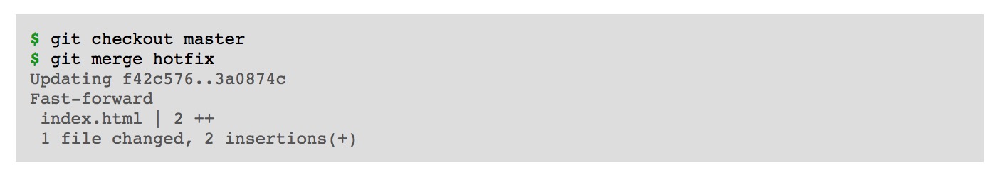 我们可以看到,hotfix 与 iss53 都是基于master所开设的两个分支。当我们在分支(hotfix)进行完紧急修复后,并测试没有为题后,这时,我们再切换到master上将hotfix合并进来(git