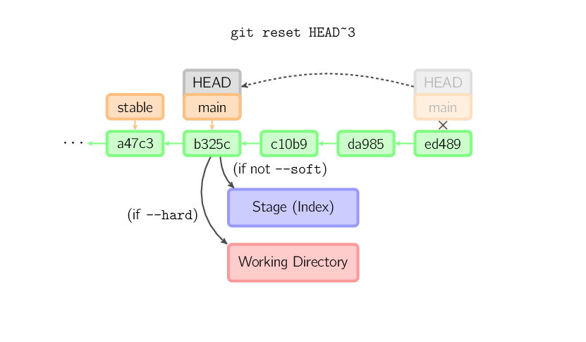 如果不给选项,那么当前分支指向到那个提交。如果用--hard选项,那么工作目录也更新,如果用--soft选项,那么都不变。