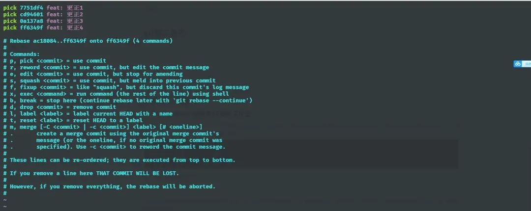修改文件后 按下 : 然后 wq 保存退出,此时又会弹出一个编辑页面,这个页面是用来编辑提交的信息,修改为 feat: 更正 ,最后保存一下,接着使用 git branch 查看提交的 commit 信息,rebase 后的提交记录如下图所示,是不是清爽了很多?rebase 操作可以让我们的提交历史变得更加清晰。