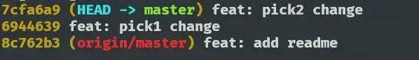 commit-hash 表示的是某次 commit 的 hash 值。现在,依次执行以下两条指令 git cherry-pick e0bb7f3 、 git cherry-pick c9a3101 ,过程中,如果出现冲突,解决冲突后 进行 git add ,接着执行 git cherry-pick --continue ,最后,master 上的提交如下