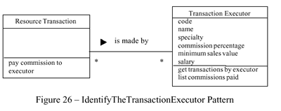 图26表示了IdentifyTheTransactionExecutor模式,提供与特定事务相关佣金的方法被添加到"Resource Transaction"类中。"Transaction Executor"类有属性代码、姓名、专业、佣金比例、最小销售额和薪水,还有通过执行者获得事务方法,和列出已付佣金方法。