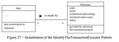 示例: 图27表示IdentifyTheTransactionExecutor模式的一个实例,其中,"Sale"扮演"Resource Transaction","Salesman"扮演"Transaction Executor"。