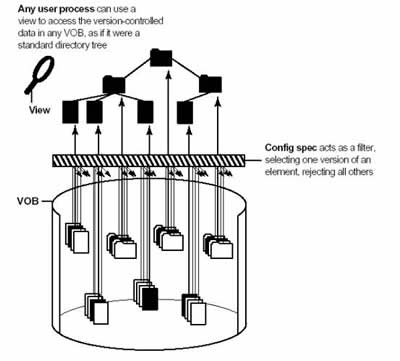 VOB是ClearCase存储软件系统各个组成元素的所有版本数据的仓库,一个版本是其中包含的特定文件或目录;VIEW则是通过一定的规则选择出来的各个元素特定版本的集合,用户通过VIEW存取、修改各个元素。