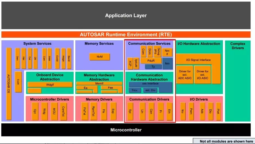 如下图1所示为常见AutoSAR基础框架,其中红框部分为与通讯相关的部分,包括LIN、CAN、Eth等。