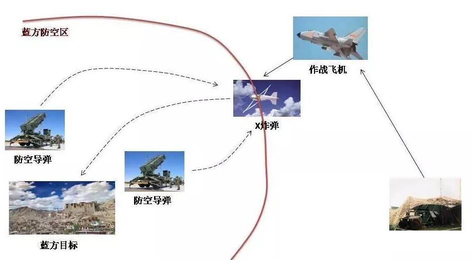 本案例采用图片的方式表达高层作战概念。红方指挥所指挥作战飞机轰炸蓝方目标,由于蓝方防空导弹的存在,作战飞机需要突破蓝方放空区方可执行任务,严重威胁飞机安全。因此需要一款x炸弹,可使作战飞机在蓝方防空区外投放,保证飞机安全并实现作战目标。