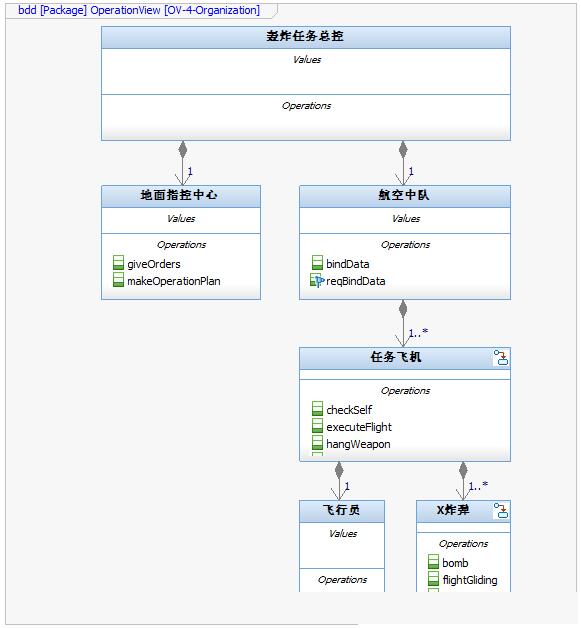OV-4阐述的是各种角色、组织之间的指挥结构或关系,使用SysML图中的模块定义图(BDD)实现。