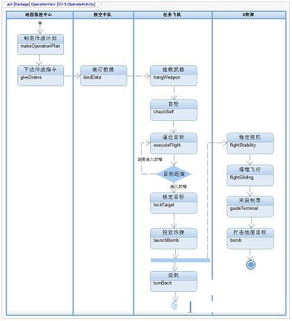 在活动图中,建立活动及活动间的输入输出关系,通过泳道划分组织和角色,这样与OV-4中的组织、角色就建立了关联。同时,泳道内部的作战活动即分配给了对应组织或角色。