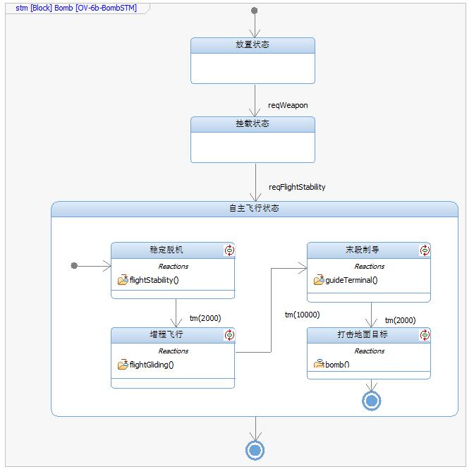 在OV-5中没有充分表示活动序列是如何对外部、内部事件做出反应的。作战状态转移描述(OV-6b)可以被用来描述清楚的作战活动顺序。使用SysML中的状态机(STM)描述OV-6b。