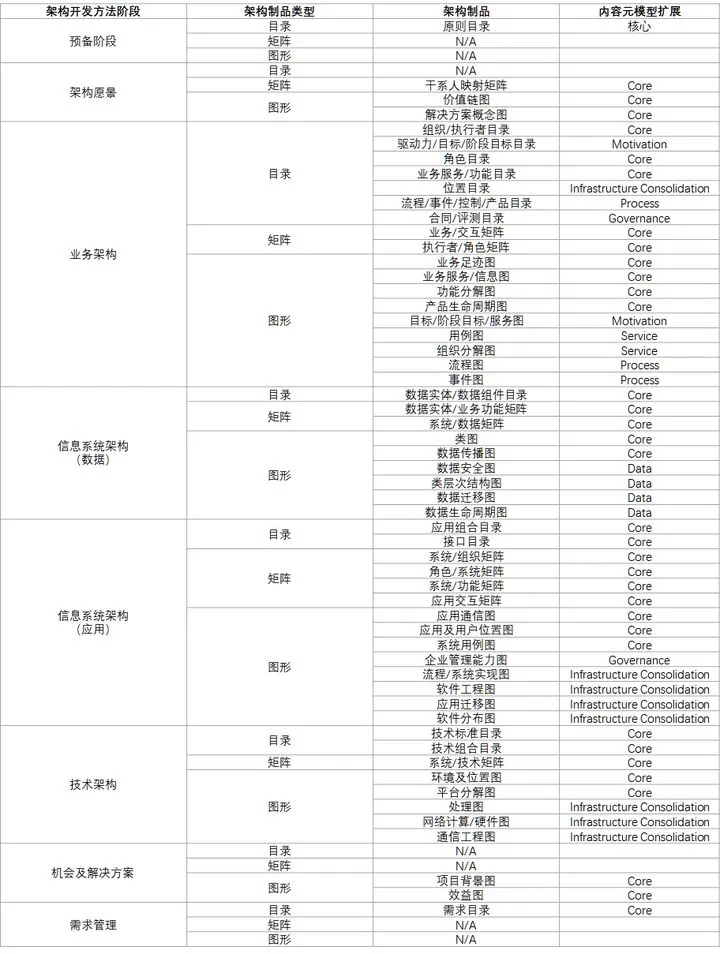 在内容框架中,企业架构开发方法过程中所涉及到的各种工作产品被归纳为如下几种: