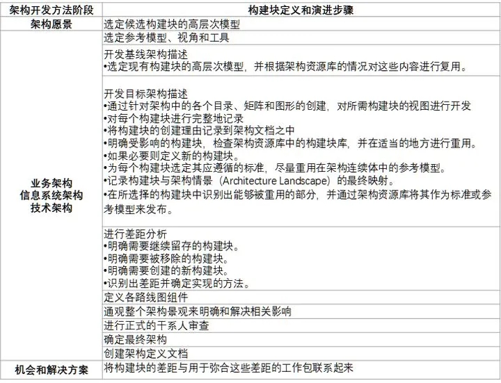 架构开发方法的各个阶段对于构建块的定义和确定有着紧密的联系,特别是架构愿景、业务架构、信息系统架构和技术架构这几个阶段,包含在这些企业架构开发方法阶段之中对构建块进行定义和演进的步骤总结如下: