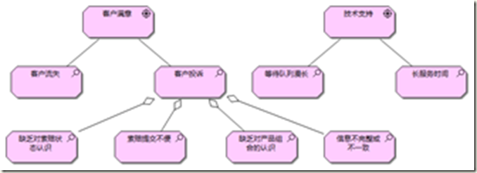 实例:本案例列举了两个驱动力,分别为“客户满意”和“技术支持”。对于驱动力“客户满意”来说,它具有两个评估结果:“客户流失”和“客户投诉”,而后者还可细分为“缺乏对索赔状况认识”、“索赔提交不便”、“缺乏对产品组合的认识”和“信息不完整或不一致”这四个评估元素;对于“技术支持”驱动力来说,其评估结果为“等待队列漫长”和“长服务时间”。