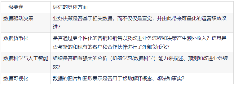 4. 数据能力:企业能够应用数据分析进行业务决策的程度,包括数据可得性以及数据分析能力两个方面。打造强有力的数据能力涉及数据战略、数据架构、数据治理、数据安全、人员技能等多个方面;