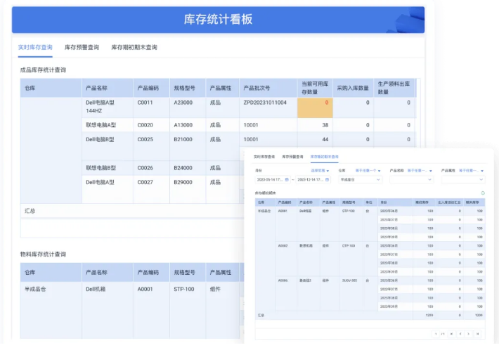 库存期初期末:产品库存期初期末统计,支持日、周、月维度,以精细化统计出入库业务活动,便于财务统计