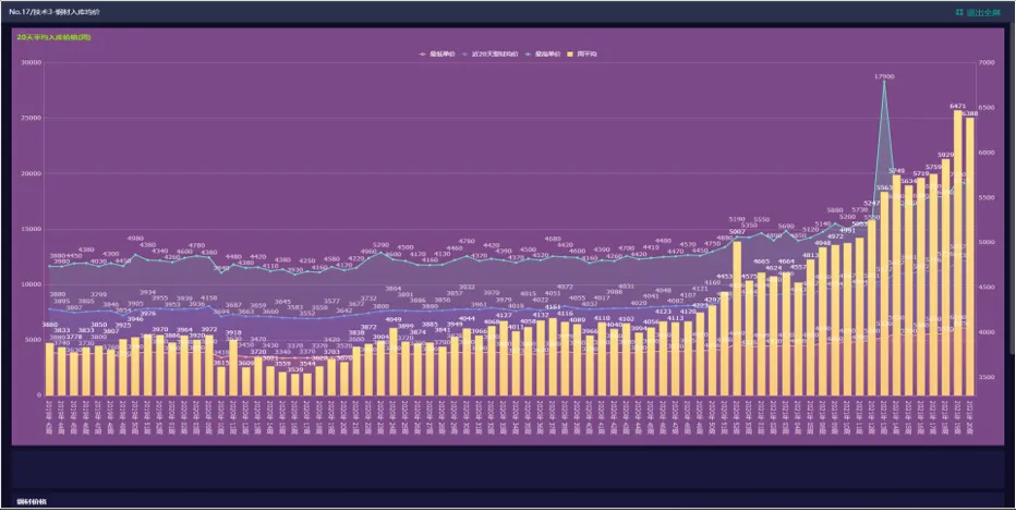 龙辉起重在原材料的入库的时候就录入当天价格,同时在里边设置简单的分析,搭建了仪表盘,在这上面显示我们这个主要原材料的价格波动趋势。