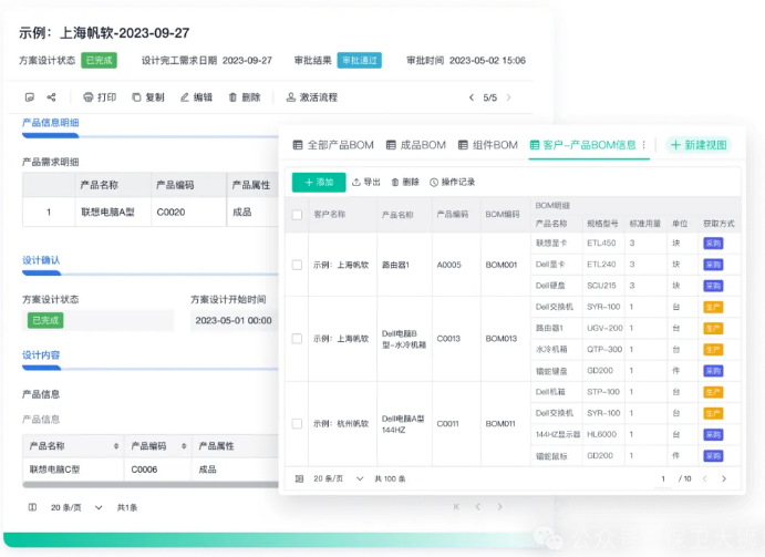 方案设计流程:报价单、销售订单可发起方案设计的子流程,并对设计状态、效率进行监控