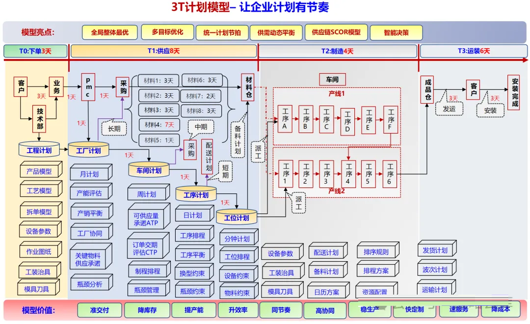 计划模型 :实现四个层次的计划调度,保证科学的优化产能、交期和资源配置。