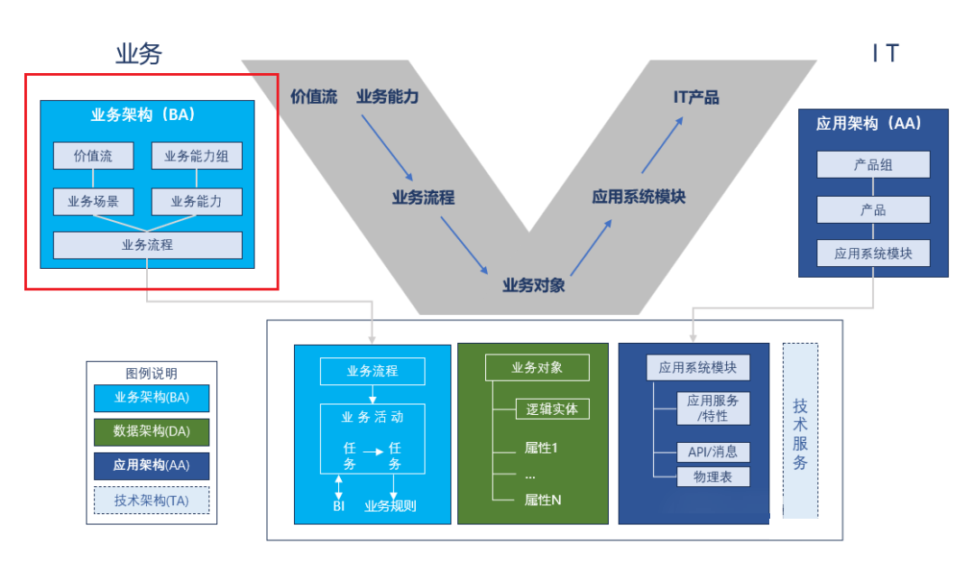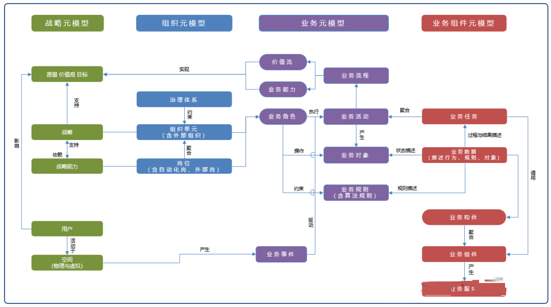 Architecture)的核心组成部分,主要通过价值流、业务域、业务能力、业务流程、业务对象等业务要素,站在全局视角,对企业整体或某个领域的业务模式进行结构化描述。