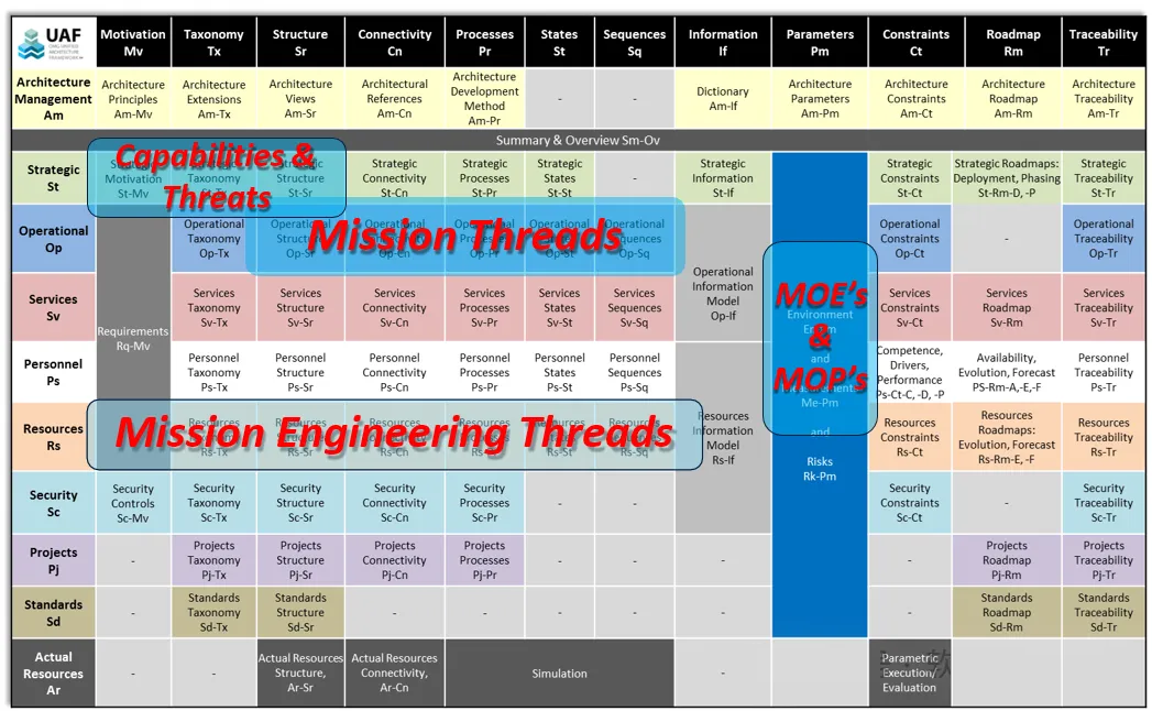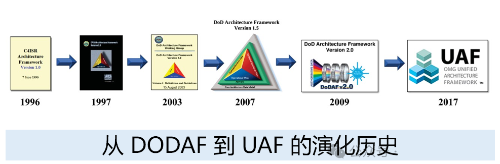 UAF 是由对象管理组织(OMG)开发的统一架构框架,整合了 DoDAF、MODAF 和 NAF。下图为