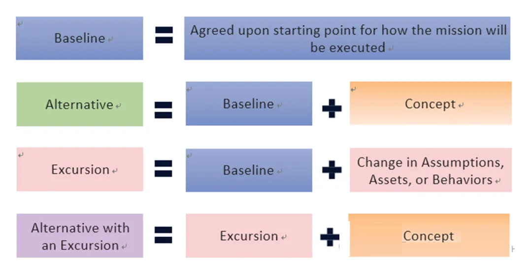 与备选不同的是,偏离(excursion)的建模是为了表示基线中假设、任务元素和行为的变化。