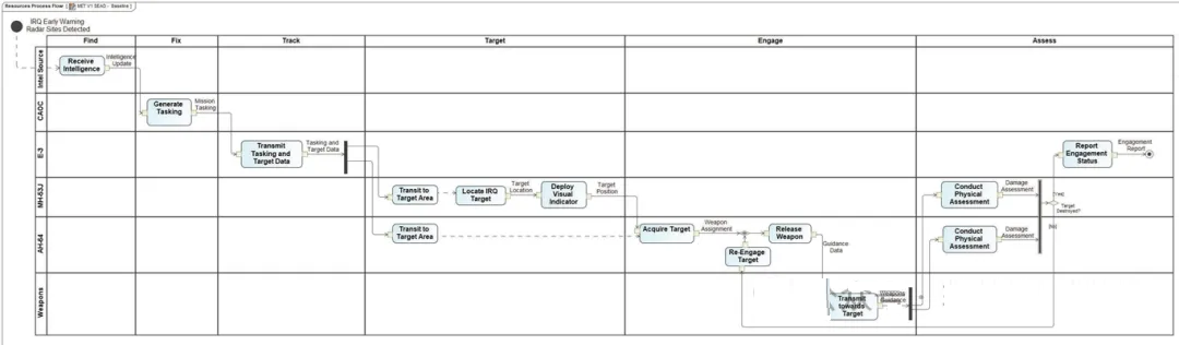 任务工程线程的端到端视图,用于显示任务元素之间的连接和信息交换。端到端视图可用于识别任务工程线程中存在的潜在差距或漏洞。