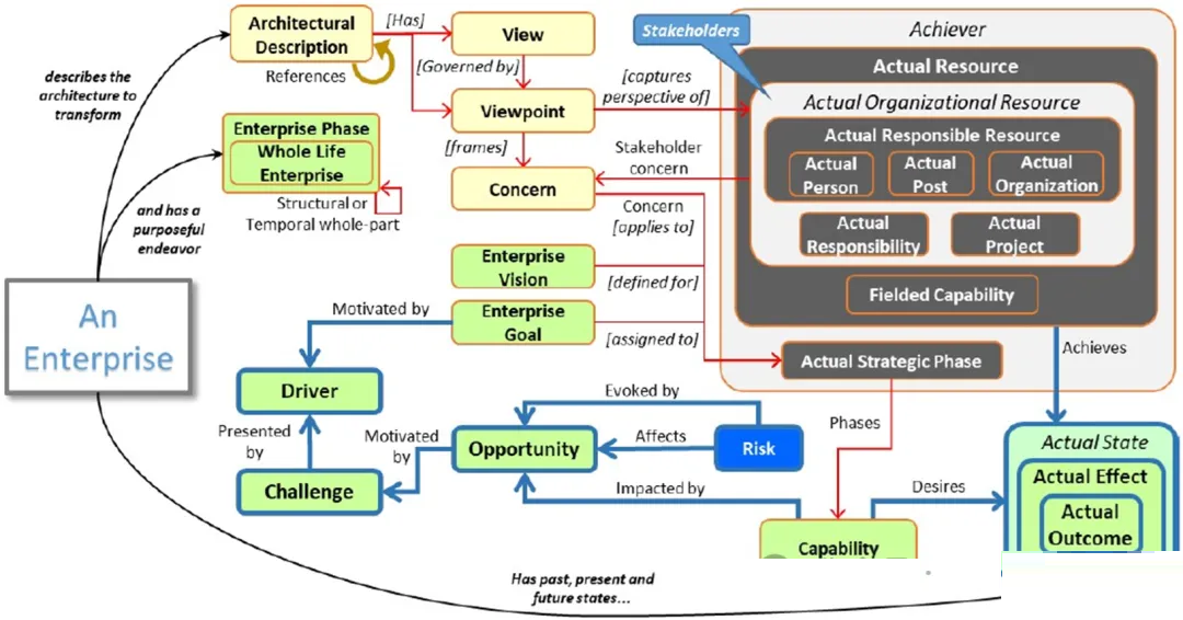 下图展示了UAF概念模型中战略要素之间的关系。企业驱动因素(Driver)会引发挑战(Challenge)或机会(Opportunity),企业需要具备相应的能力(Capability)来应对挑战或把握机会,从而实现期望的效果(Desired