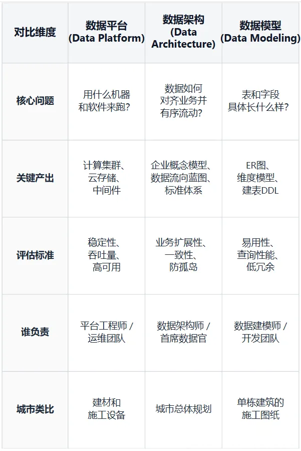 简单说:数据平台是"建材和施工队",数据架构是"城市总体规划",数据模型是"单栋建筑的施工图纸"。
