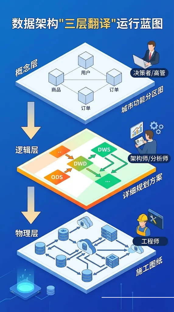 很多失败的数据项目,根源在于跳过前两层,直接让程序员在物理层建表。这就像没有城市规划就开始盖楼——盖完发现商业区在城市边缘,学校离住宅区十公里。